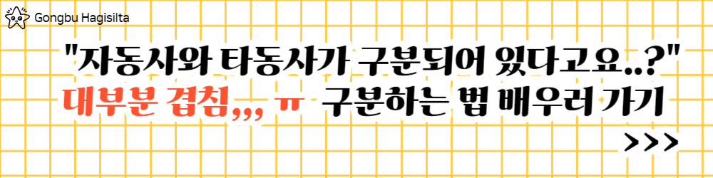 하지만 준동사는 늘 그렇듯이 호락호락하지만은 않습니다. 동사였던 과거가 있기 때문에 문장에서 목적어를 가지고 있을 수 있습니다... 슬프게도 길어진다는 소리죠. 예를 들어 '피아노를 연주하다'라는 목적어와 서술어(동사)가 있다면, 이걸 그대로 명사자리에 넣는다고 생각하면 '피아노를 연주하는 것'이 되겠죠. 이때 동명사는 어떤 친구를 그대로 데려왔나요? '피아노를'이라는 을/를이 붙는 목적어를 명사자리에 그대로 데려왔죠. 즉 동명사는 동사였을 때의 목적어를 그대로 데려옵니다. 그리고 그걸 하나로 묶어서 해석해줘야 합니다. 정확히 말하면 동사가 타동사라면 목적어를 데리고 오고 자동사이면 목적어를 데리고 오지 않습니다. 혹시 자동사와 타동사가 궁금하시다면 아래 배너를 클릭해 확인해 주세요.