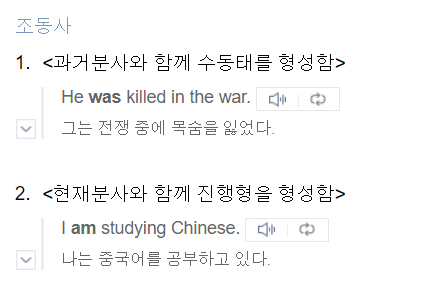 그럼 위 문장을 이제 분사의 동사파 입장에서 설명해보겠습니다. dancing인 현재분사는 동사입니다. 엇? 그러면 Be동사는 동사가 아닌가요?라고 하게 됩니다. 정확히 말하면 여기서 Be동사도 동사가 맞습니다. 다만 조동사로 역할이 바뀝니다. 흔히 우리의 사전을 찾아서 아래로 내려보면 이렇게 다음과 같이 조동사를 찾을 수 있습니다.
