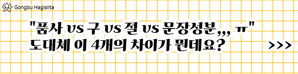 8 품사와 문장성분 구와 절 등의 차이를 혹시 아시나요? 더 알아보고 싶다면 아래 배너를 클릭해 확인해보세요!